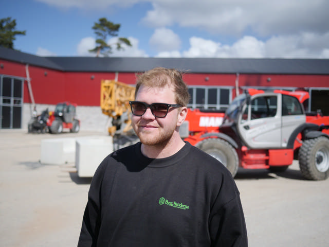 - Den här maskinen har vi bara haft i ett år ungefär. Den kommer vi att använda till att fylla på material till betongtillverkningen, och även lyfta alla olika prefabricerade element vi tillverkar. Jag upplever att den är extremt stark och stabil. Den känns lika stabil och stark som en L90 hjullastare, och då ska man inte glömma att den kan lyfta sju meter högt också, tillägger Martin Fast.